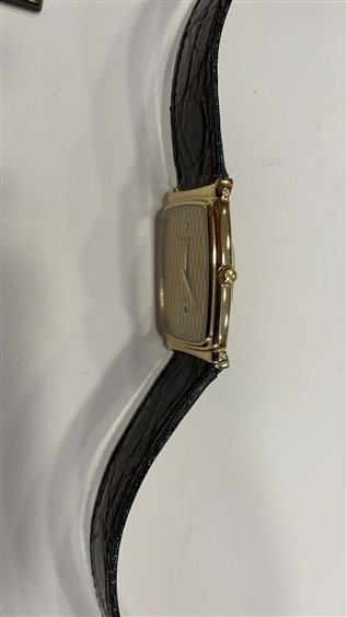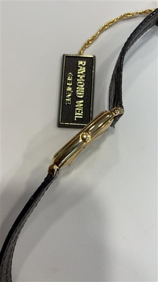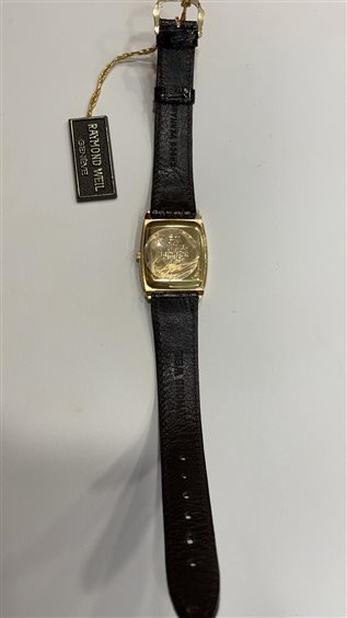 OROLOGIO RAYMOND WEIL UNISEX CASSA IN ACCIAIO PLACCATO ORO GIALLO A 10 MICRON QUADRANTE RETTANGOLARE FONDO DORATO SOLO TEMPO CON DATARIO POSIZIONATO AL NUMERO 6 CINTURINO PELLE MARRONE CON CHIUSUSRA ARDIGLIONE IN ACCIAIO PLACCATO ORO GIALLO.