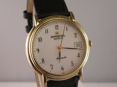 OROLOGIO RAYMOND WEIL 18KT ELECTROPLATED 10 MICRON,MOVIMENTO AUTOMATICO SWISS MADE CON DATARIO ULTRA PAITTO, QUADRANTE BIANCO CON INDICI ROMANI SMALTO NERO ,WR 3 ATM, CINTURINO CUIO STAMPATO NERO,FIBBIA CON LOGO RW