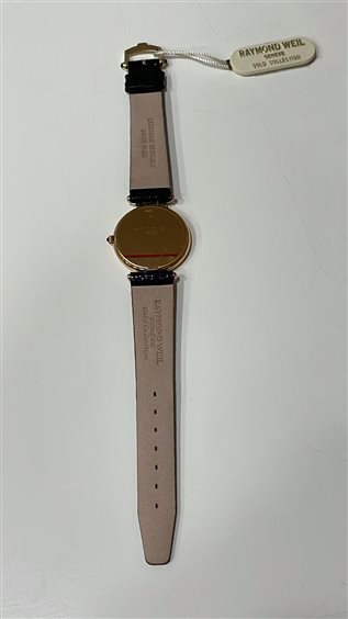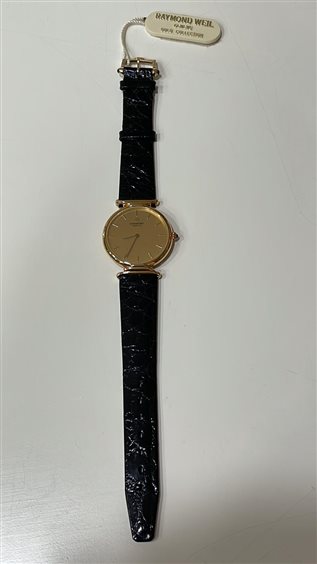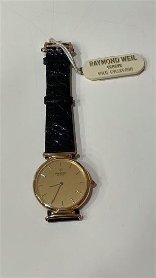 OROLOGIO RAYMOND WEIL UOMO CASSA IN ORO GIALLO KT 18 FONDO ORO GIALLO KT 18 SOLO TEMPO CON CINTURINO COCCODRILLO NERO CHIUSURA ARDIGLIONE IN ACCIAIO PLACCATO ORO GIALLO.
