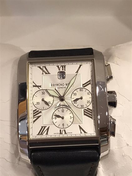 Orologio Raymond Weil uomo "don giovanni" cassa bombata in acciaio di forma rettangolare con quadrante argento numeri romani in rilievo e lancette luminescenti,movimento meccanico rw 7200 a carica automatica e funzioni di cronografo,28800 alternanze/ora,riserva di carica 42 ore funzioni di cronografo: contatore dei secondi(60 secondi):quadrante di forma circolare alle ore 3 contatore dei minuti(30minuti):quadrante di forma circolare alle ore 9 contatore delle ore (12 ore):quadrante di forma circolare alle ore 6 data alle ore 12 vetro zaffiro bombato con trattamento antiriflesso applicato su entrambi i lati cassa con fondello trasparente in vetro zaffiro impermeabilità 3 atm.