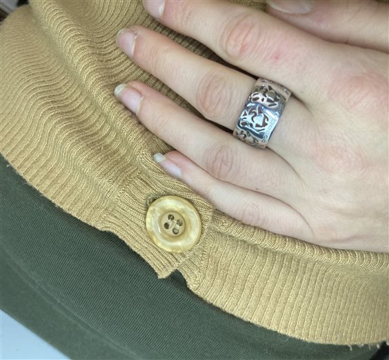 Anello a fascia in acciaio con decori traforati.