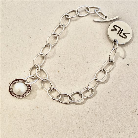 BRACCIALE REBECCA IN ACCIAIO CON CIONDOLI LOGO E PERLA. REGOLABILE.