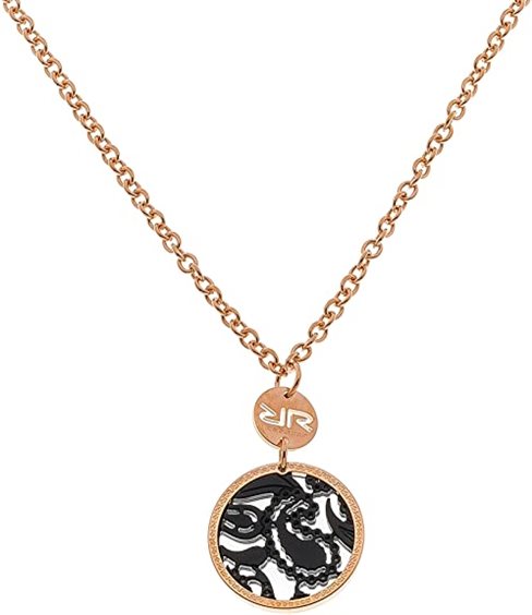 Collana Rosè, con pendente a cerchio internamente arricchito con disegni floreali.