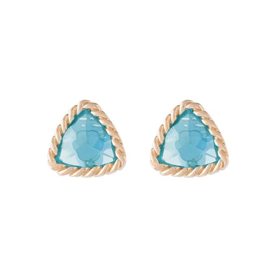 Orecchini in bronzo placcato oro giallo con pietre idrotermali con nuances di colore verde acquamarina taglio triangolare.