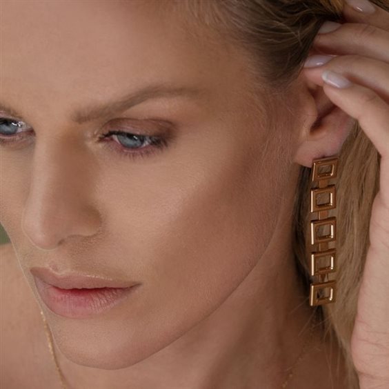 Orecchini Ludi in bronzo placcato oro a catena a maglia quadrata. Lunghezza orecchino 10 cm circa.