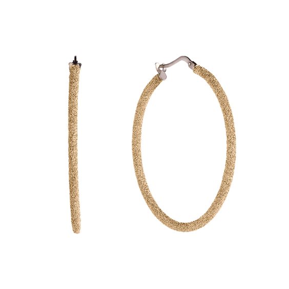 Orecchini della collezione Jolie in argento 925/°°° laminato oro giallo, rivestiti con sabbia di diamanti. Il diametro è di cm.2,50.