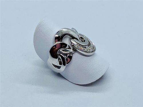 ANELLO MAISON "RECARLO" IN ORO BIANCO 18 K CON DIAMANTI TAGLIO BRILLANTE PER Ct 0,13. ANELLO CON DESIGN MOLTO ACCATTIVANTE COMPOSTO DA UNA CATENA DI ANELLI ASIMMETRICI CARATTERIZZATO DA UN DOPPIO ANELLO MOBILE CON UNA MEZZA LUNA DI DIAMANTI. ALL'INTERNO PUNZONE IN ORO PURO CON MARCHIO RECARLO