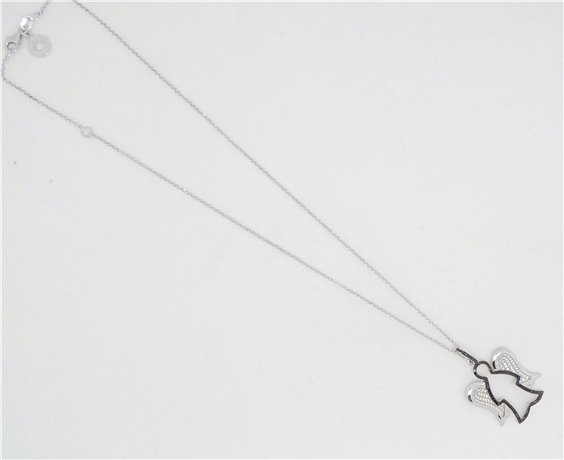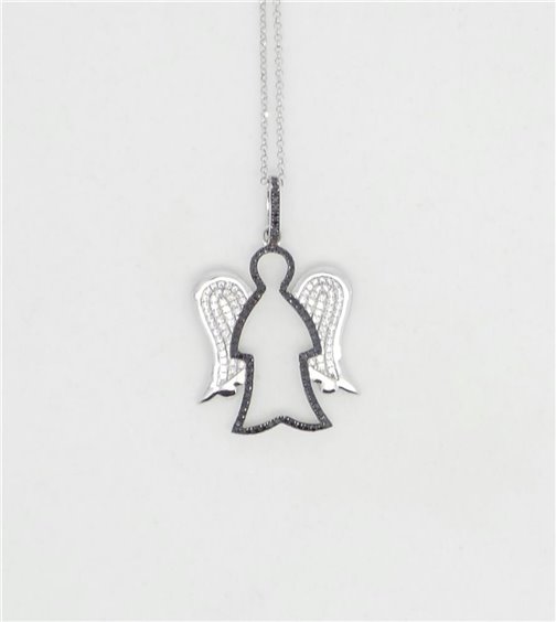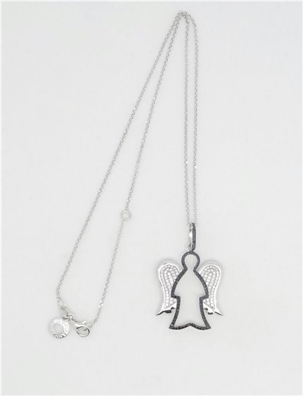 Girocollo in argento 925, con pendente a forma di angelo con zirconi bianchi e neri. Lunghezza catena cm 45, con possibilità di accorciare a cm 40. Dimensioni pendente cm 4, larghezza massima cm 2,5. Peso totale Gr. 8,50.