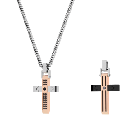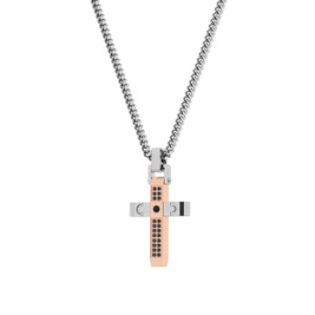 Collana groumette in acciaio con croce in acciaio pvd rosa e spinelli, cm 2, può essere messa anche al contrario.