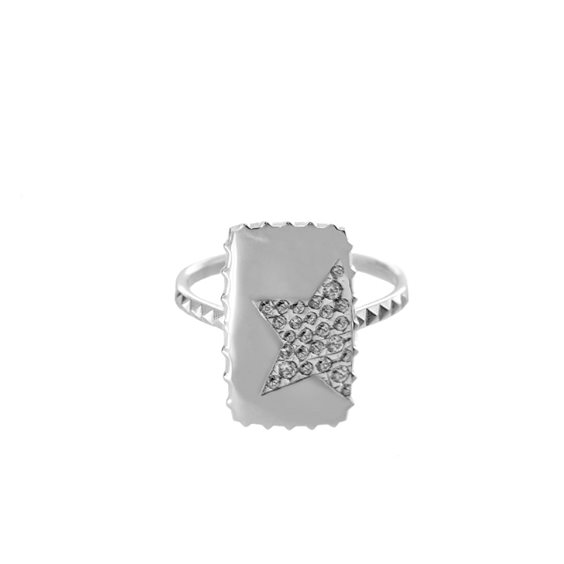 Anello con medaglia rettangolare e stella zirconi e mini borchie sul gambo La medaglia è lunga 1,8 cm e larga 1 cm. L'anello è aperto e si può quindi regolare la misura maneggiandolo con delicatezza.