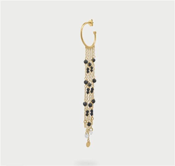 Mono-orecchino con cerchio e cascata di catene della collezione Gipsy Chic incarnano perfettamente lo spirito libero e luminoso del brand. Realizzati in argento 925 con una brillante finitura dorata, presentano una struttura a cerchio dalla quale scendono morbide catene decorate con pepite di zirconi milky. Il movimento fluido e la brillantezza dei dettagli li rendono l’accessorio ideale per aggiungere carattere e fascino a qualsiasi outfit, dal più casual al più elegante. Pensati per chi ama distinguersi con uno stile bohémien ma deciso. Materiale: Argento 925 con galvanica oro giallo, zirconi milky Colore nero Finitura: oro18kt giallo Chiusura: Farfallina