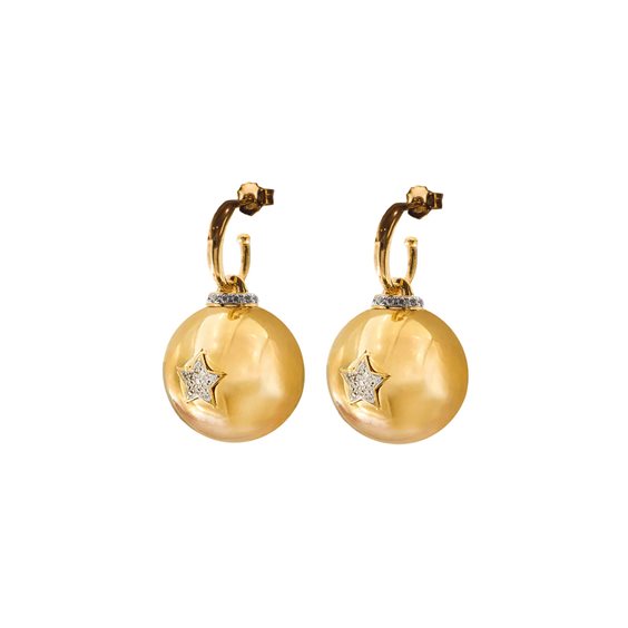 Coppia di orecchini con sfera large size elettroformata e stella centrale in zirconi. Le rotondità della leggerissima sfera elettroformata riflettono la luce e illuminano ogni outfit. La collezione Starball è in perfetto equilibrio gravitazionale fra consistenza e leggerezza, linee sinuose e polvere di stelle. Argento 925, galvanica oro 18 kt e zirconi. Diametro sfera: 2cm Nichel free
