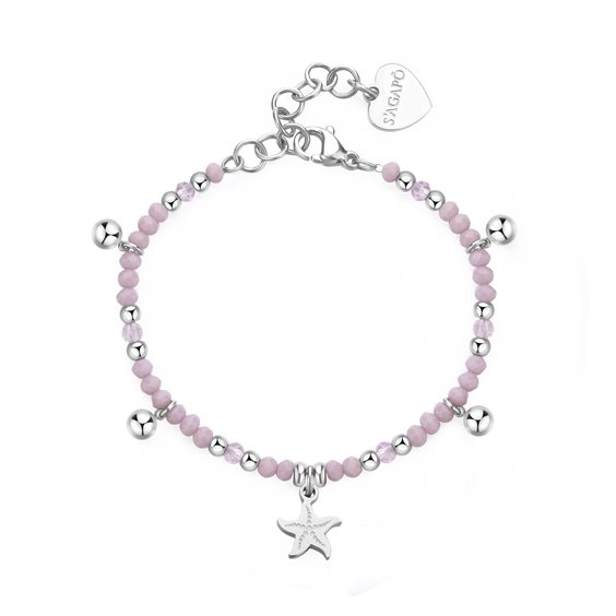 Bracciale in acciaio 316L con sfere in vetro rosa, pendenti a sfera e pendente centrale a forma di stella marina.