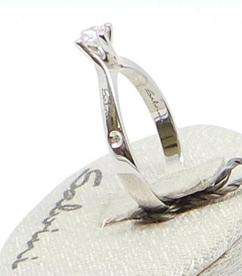 Anello solitario in oro bianco con diamante della linea Classici Solitari, made in Italy. L'importante fusto in oro bianco 750/ooo presenta un design elaborato che segue il canone classico, e presenta nella parte superiore una montatura avvolgente a quattro griffe nella quale è incastonato uno splendido diamante (totale pari a ct 0,25 ). Inoltre il logo 'Salvini' inciso al laser sulla parte laterale del gambo e un piccolo diamantino firma questo gioiello .