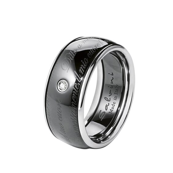 FRAMMENTI D AUTORE Anello a fascia Salvini in oro bianco 9 kt e diamante su ceramica nera impreziosito da uno stralcio di poesia d autore