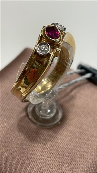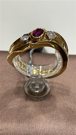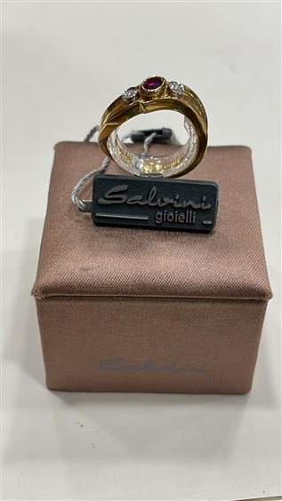 ANELLO SALVINI IN ORO GIALLO KT18 CON RUBINO CENTRALE KT 0.36 E BRILLANTI KT 0.06 H. MISURA ANELLO 14. PESO ANELLO 4.70 GR.