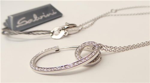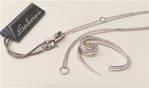 Collana Salvini Collezione Spilla in oro bianco 750% a doppia catena lunghezza 40 cm. allungabile a 45 con ciondolo sfilabile che può essere indossato come spilla, dimensioni del ciondolo 27 mm. x 17 mm. spessore 5,7/1,7 mm. con 45 diamanti taglio brillante ct 0,36 H. Peso complessivo collana 5,8 grammi. Chiusura personalizzata a moschettone con diamantino. Garanzia e Certificato di Autenticità Salvini con scatola originale.
