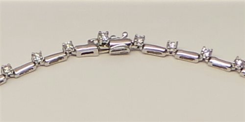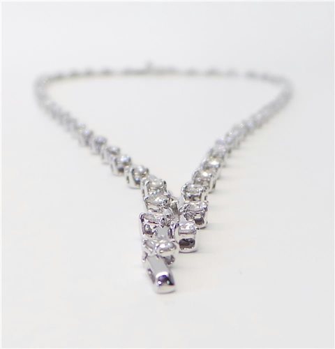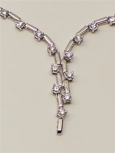 Collier semirigido ad elementi in oro bianco 750% lucido, snodati tra loro con 58 diamanti taglio brillante ct. 2.84 H-IF certificati montati su castoni a cestino. Lunghezza collier 40 cm. con elementi centrali pendenti di 3 cm. Lunghezza elementi oro 7 mm. spessore 1,9 x 1,8. Dimensioni castoni 2,6 X 2,5 mm. Peso 14 grammi. Chiusura a linguello con sicurezza. Garanzia e Certificato di Autenticità Salvini con assicurazione (rapina e scippo)e scatola originale.