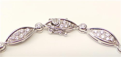 Collana in oro bianco 18 Kt composta da 21 elementi in oro e pavè di diamanti snodati tra loro da punti luce di diamanti. I nove elementi centrali sono di grandezza crescente. Caratura totale ct. 3,97 H- Vvs1 (diamanti taglio brillante). Chiusura a linguello con doppia sicurezza di forma uguale ad elementi collana. Peso 42,7 gr. Lunghezza 41 cm. Garanzia e Certificato di Autenticità Salvini con assicurazione rapina e scippo con scatola originale.