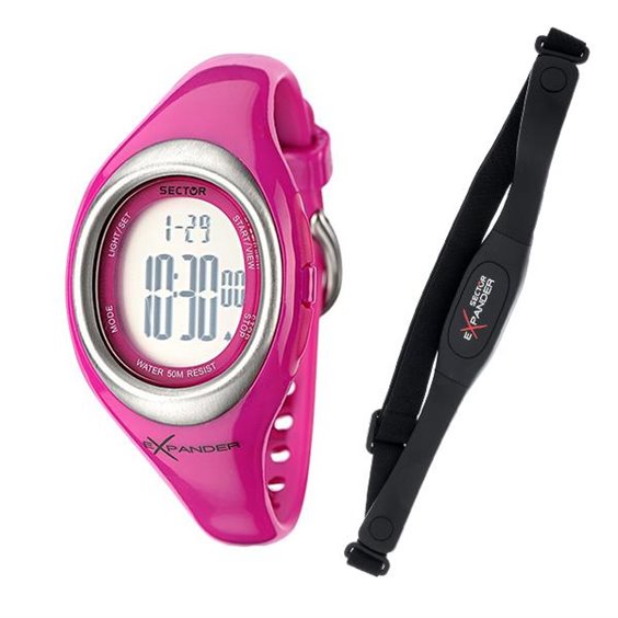 Movimento: Quartz Cassa: Acciaio con cover in silicone, 36 mm Fondo: Acciaio, con viti Vetro: Minerale, piano Corona: Pulsantiera 4 pasti in poliuretano Quadrante: Fucsia Cinturino: Silicone, fucsia Chiusura: Acciaio, ardiglione Water resistant: 5 atm Funzioni: Cronografo 1/100 sec con tempi parziali e intermedi WR: 50 mt Fascia toracica inclusa per funziona cardio.
