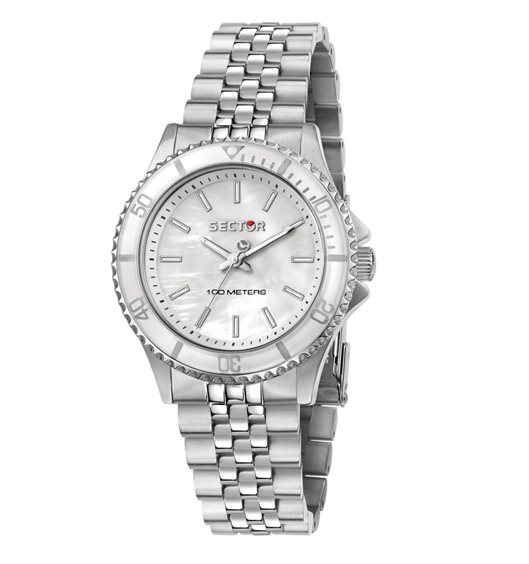 Orologio, solo tempo, al quarzo con cassa e cinturino in acciaio; quadrante madreperla con ghiera di colore bianco. Vetro minerale e impermeabilità 10 ATM 3 anni di garanzia