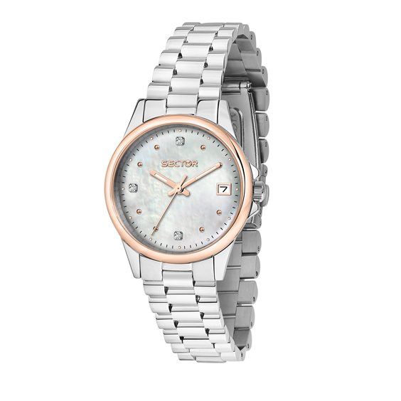 Orologio Sector. Cassa (mm 32) e cinturino in acciaio 316L. Ghiera con trattamento PVD oro rosa. Quadrante madreperla con indici e lancette color oro rosa, zirconi al 12, al 6 e al 9, datario al 3. Movimento al quarzo, vetro minerale. Impermeabilità 10 atmosfere.