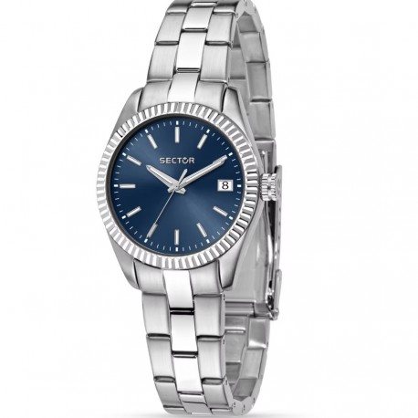 Orologio Sector 240. Cassa (mm 32) e cinturino in acciaio. Quadrante blu con indici applicati e datario al 3. Movimento al quarzo, vetro minerale. Impermeabilità 5 atmosfere.