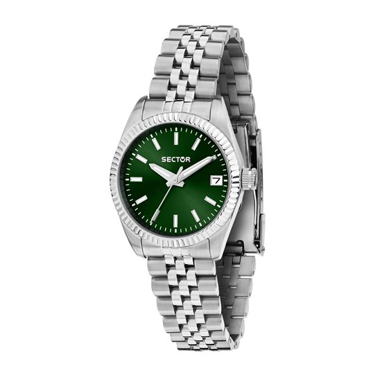 Orologio Sector 240. Cassa (mm 32) e cinturino jubilee in acciaio 316L. Quadrante verde con datario al 3. Vetro minerale, movimento al quarzo solo tempo. Impermeabilità 5 atmosfere.