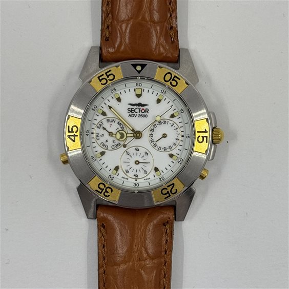 OROLOGIO SECTOR UOMO AL QUARZO CON CASSA IN ACCIAIO, QUADRANTE BIANCO, MULTIFUNZIONE, CINTURINO IN PELLE MARRONE, 100 M WATER RESISTANT, SWISS MADE.