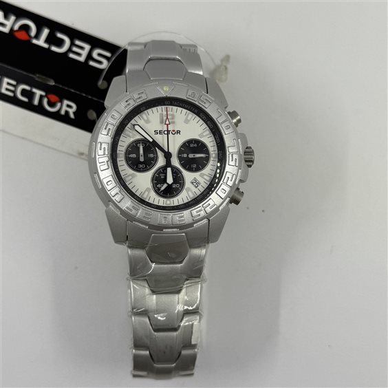 OROLOGIO SECTOR CON CASSA E CINTURINO IN ALLUMINIO, QUADRANTE ARGENTO CON DETTAGLI NERI, CRONOGRAFO, 100 M WATER RESISTANT, AL QUARZO.