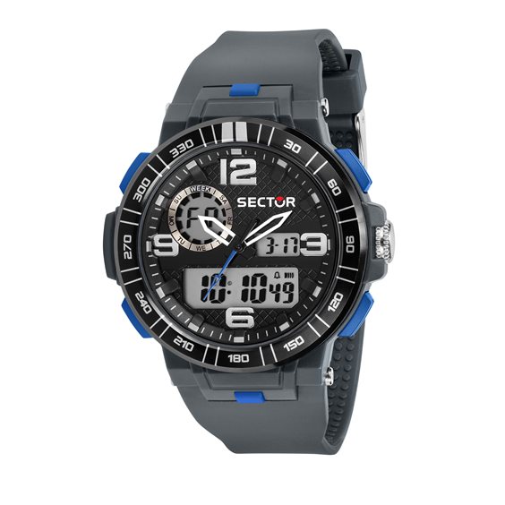 Orologio Sector EX-28 analogico e digitale al quarzo da uomo, diametro 46mm, spessore 16mm, Peso 49gr. Vetro plaxiglas, display positivo, cassa resina grigia 5atm, cinturino gommagrigio.