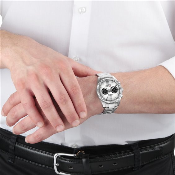 Genere : Uomo, Materiale e finitura cassa: Acciaio, Misura cassa: 48x41mm, Spessore cassa: 12,3, Finitura cassa: Acciaio, Vetro: Minerale, Materiale cinturino: Acciaio, Colore cinturino: Argento, Movimento: Quarzo, Water resistant: 5 atm,