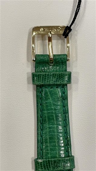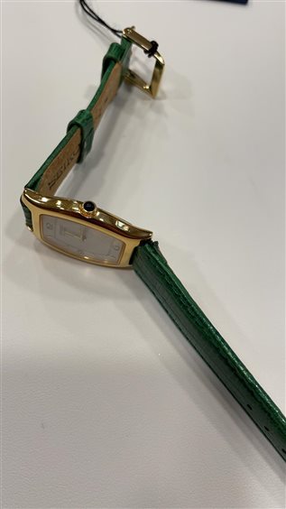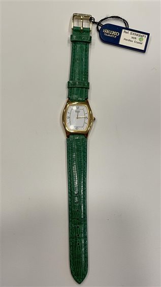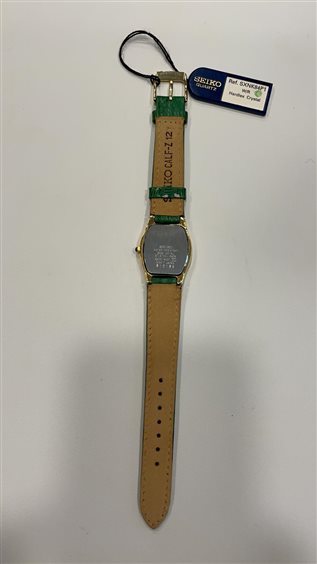 OROLOGIO SEIKO DONNA CASSA IN ACCIAIO PLACCATO ORO GIALLO QUADRANTE RETTANGOLA FONDO BIANCO SOLO TEMPO. CINTURINO PELLE VERDE CHIUSURA ARDIGLIONE IN ACCIAIO PLACCATO ORO GIALLO.