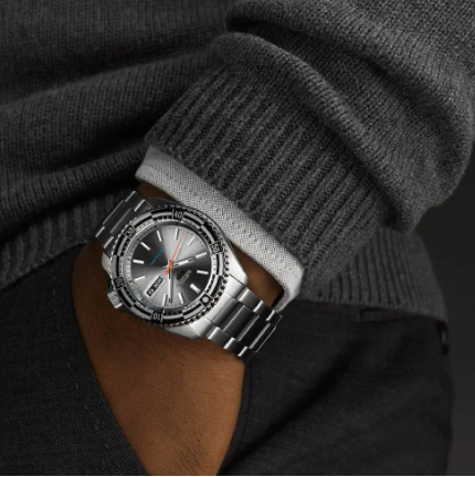 Particolare per la finitura acciaio argentata di cassa bracciale e quadrante. Ghiera insolita. 100metri corona a pressione, fondello a vista movimento.