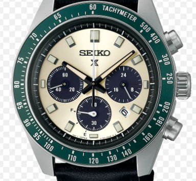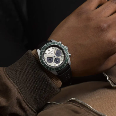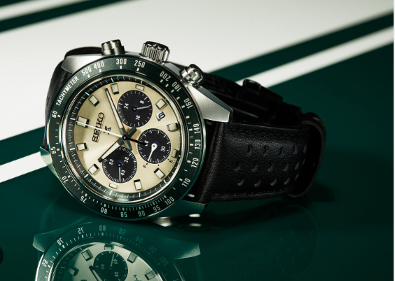 Calibro V192 SOLAR SEIKO. crono dal design e stile anni 60/70. particolarità riserva di carica indicata sul circolare a ore sei. vetro zaffiro ad esaltare i colori crema con circolari verde scuro del quadrante. ghiera verde in alluminio. fondello avvitato su cassa in acciaio diametro 41.40mm anse 21 spessore 13mm. bracciale in pelle apertura deployante.