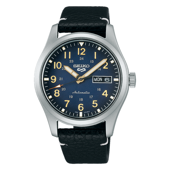 Orologio Seiko della Collezione 5 Sports Military con indicazione della data e del giorno e delle 24 ore, Movimento Automatico con fondello a vista, impermeabile fino a 10 BAR, 39,4mm di diametro, vetro Hardlex, cassa in acciaio, cinturino in Pelle di vitello.