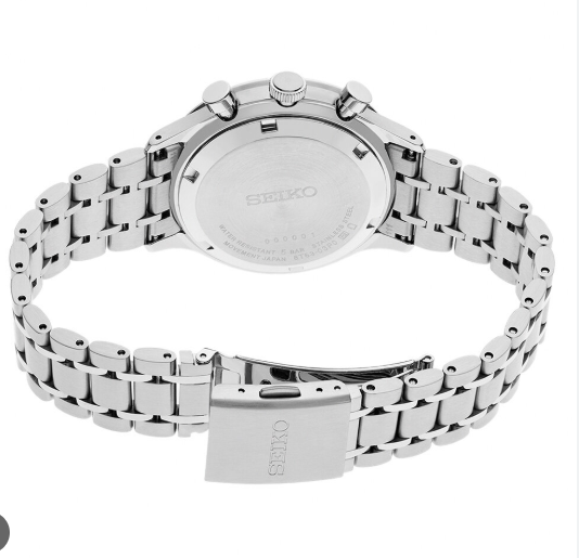 Orologio SPORT ~ Cronografo al quarzo. Questo orologio al quarzo della collezione Seiko SPORT offre una serie di funzioni. Il quadrante nero presenta tre contatori cronografici ed è circondato da una lunetta tachimetrica. Realizzato interamente in acciaio inossidabile, questo modello è anche molto robusto grazie al vetro Hardlex, al fondello avvitato e all'impermeabilità fino a 100 metri.