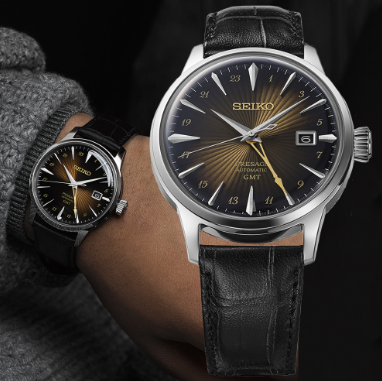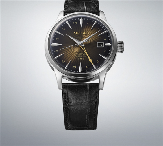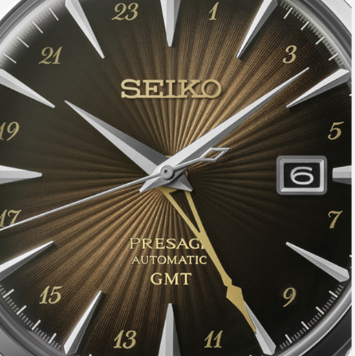 La linea Cocktail, un punto fermo della collezione Présage fin dal lancio del SARB065, offre orologi eleganti con quadranti dai colori scintillanti e finiture a raggi di sole. Ad ogni nuovo lancio, questa gamma si arricchisce di nuovi colori, nuove funzioni ispirate alla cultura giapponese e al famoso Star Bar del quartiere di Ginza. Sempre nei colori di uno dei cocktail tipici del bar, questo nuovo modello offre una funzione mai vista prima nella linea: la lancetta GMT. La lancetta, a forma di stelo di bicchiere da cocktail, colloca l'orologio in una nuova dinamica di eleganza e di viaggio. CALIBRO 4R34. CARICA MANUALE E AUTOMATICA CON FONDELLO A VISTA MOVIMENTO. DATARIO E LANCETTA GMT. VETRO HARDLEX BREVETTO SEIKO