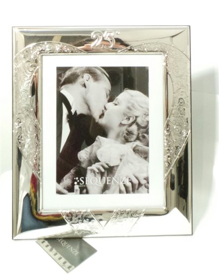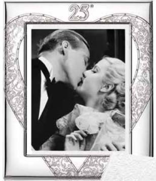 cornice preziosa in argento con lavorazione su lastra di un cuore lavorato con un disegno di tipo etrusco e impreziosito da cristalli.nel centro incisione dell'evento di 25 anni di matrimonio o compleanno.misure interne cm 18x24 esternamene cm 28,5 x 33 cm . retro in legno nero .in dotazione specchio all'interno della scatola.tutto con certificato di garanzia.