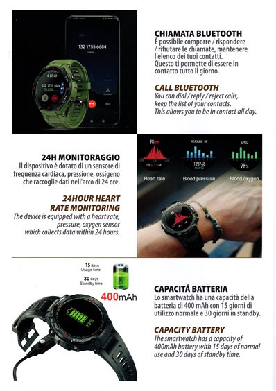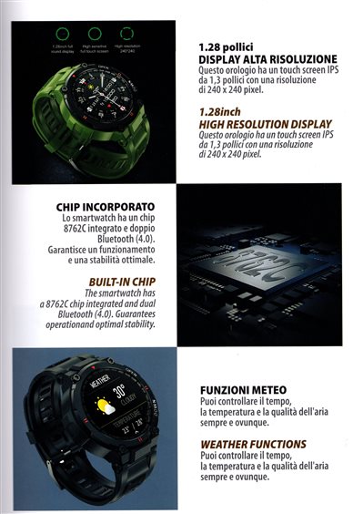 SMARTWATCH CON SISTEMA ANDROID 4.4 APPLE SUPERIORE A IOS 8.0.CHIAMATA BLUETOOTH CON CHIP INCORPORATO DA 8762C.DISPLAY ALTA RISOLUZIONECON TOUCH SCRENN IPS DA 1,3" CON UNA RISOLUZIONE DI 240X240 PIXEL.