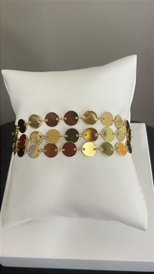 BRACCIALE SOVRANI DONNA IN OTTONE PLACCATO ORO GIALLO A 3 FILI, CHIUSURA MOSCHETTONE, MISURA BRACCIALE 18 CM ESTENDIBILE A 20 CM.