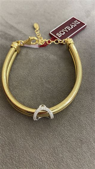 BRACCIALE SOVRANI DONNA IN LUREX, PLACCATO ORO GIALLO, CON ZIRCONI BIANCHI, CHIUSURA A MOSCHETTONE,MISURA REGOLABILE FINO A 21 CM. (Il lurex materiale è un filato sintetico metallizzato, famoso per la sua lucentezza scintillante, creato avvolgendo un sottilissimo film di alluminio (o altro metallo) con fibre sintetiche come poliestere o poliammide. Questo lo rende un tessuto leggero, flessibile ed elastico, che aggiunge un tocco glamour a capi d'abbigliamento da festa, ma anche a quelli casual).