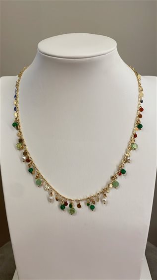 COLLANA SOVRANI DONNA IN OTTONE PLACCATO ORO GIALLO GIROCOLLO, CON CIONDOLI IN PIETRE MULTICOLOR DALLA TONALITA' VERDE E PERLINE BIANCHE, CHIUSURA A MOSCHETTONE.