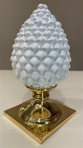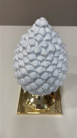 Pigna grandezza media Sovrani realizzata in Resina di colore bianco base dorata. La Pigna è un elemento con un profondo valore simbolico, riconosciuto in tutto il Mondo come simbolo di buon auspicio. E' il frutto di un albero sempreverde che resiste alle situazioni climatiche più ostili. La Pigna è infatti riconosciuta come simbolo di Vita E Di Forza che supera anche le più terribili avversità. La tradizione Popolare Ritiene che sia utile regalare delle pigne Come Augurio Di Salute E Buona Fortuna.