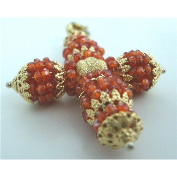 Ciondolo a croce in oro giallo 18 carati ideato e realizzato da Sun Day, il ciondolo è impreziosito da spinelli arancioni, misure 5,3 x 3,5 centimetri compreso il moschettone, peso 11,7 grammi, chiusura a moschettone.