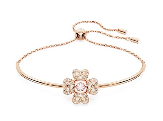 Questo splendido bracciale della famiglia Idyllia aggiungerà un tocco di lusso a qualsiasi look. Disposto su una catena con chiusura regolabile, il design placcato color oro rosa presenta un motivo portafortuna a quadrifoglio, realizzato con uno Swarovski Zirconia centrale rosa e quattro foglie decorate da un pavé di cristalli Cry. Indossalo con un paio di orecchini a quadrifoglio Idyllia per un look ispirato alla natura.