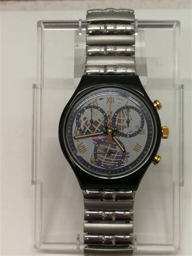 orologio swatchqu7adrante multicolor con numeri romani,movimento al quarzo cronografo,bracciale elastico in metallo acciaio.