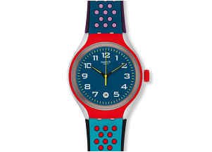 Quadrante blu con indici bianchi e gialli, lancette con superluminova e datario a ore 6. Cassa in leggerissimo alluminio con inserto in plastica satinata rossa e corona rossa. Il cinturino con rilievi in silicone usa i colori del blu, rosa e violetto nella parte superiore, e turchese, rosso e nero nella parte inferiore. Questo modello sportivo è completato da passanti rossi e gialli e da una fibbia in alluminio.