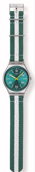 Questo orologio ultrapiatto presenta un quadrante verde con finitura spazzolata soleil, una flangia verde, indici, numeri e minuteria stampati in bianco e lancette delle ore e dei minuti gialle che si illuminano al buio. La cassa, i passanti e la mezza fibbia in acciaio sabbiato sono completati da un cinturino in tessuto a righe verdi e bianche.