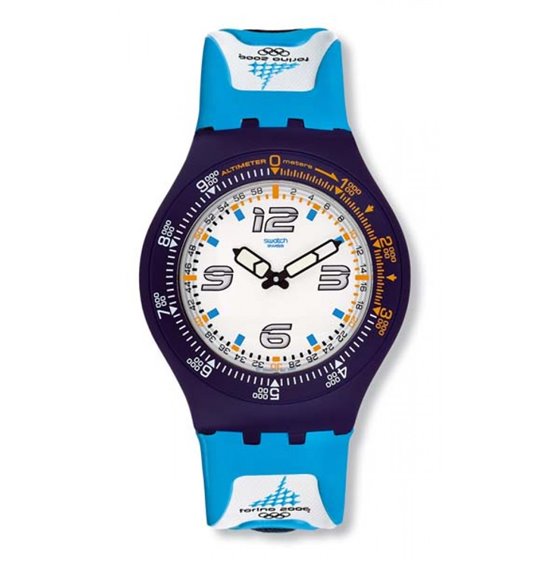 Marchio SWATCH dal 1983 leader mondiale della categoria. Orologio della linea Fun Boarder con ALTIMETRO. Cassa in plastica blu, quadrante bianco e cinturino con velcro.Resistente all' acqua, agli urti, precisione al quarzo. Materiali ipoallergenici. SWISS MADE. Scatola originale e due anni di garanzia ufficiale SWATCH.